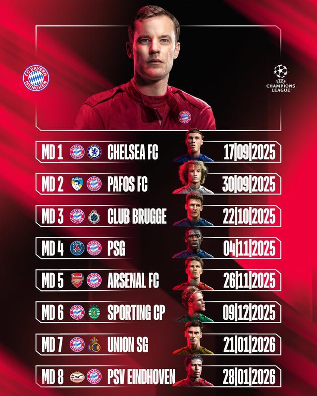 拜仁慕尼黑歐冠階段賽程:首戰(zhàn)切爾西,11月連戰(zhàn)巴黎、阿森納,歐冠,阿森納,切爾西隊,拜仁慕尼黑,巴黎圣日耳曼,飛利浦體育聯(lián)盟