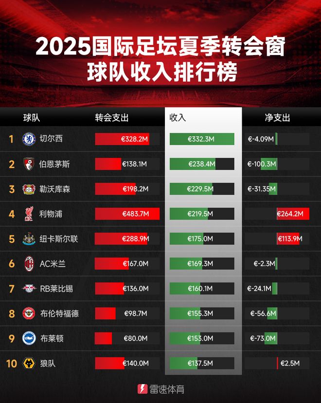 2025夏窗收入榜:切爾西3.3億領(lǐng)銜,櫻桃、藥廠緊隨其后,夏窗,櫻桃,利物浦,收入榜,切爾西隊(duì),ac米蘭,紐卡斯?fàn)栮?duì),勒沃庫(kù)森隊(duì)