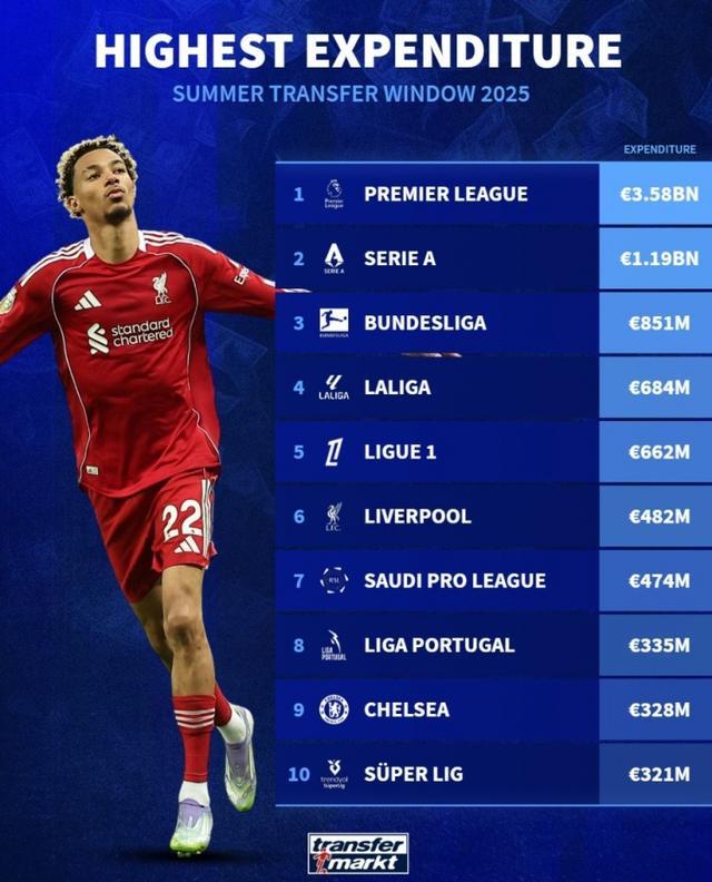 夏聯(lián)賽支出:英超35.8億領(lǐng)跑,利物浦4.82億居第6。