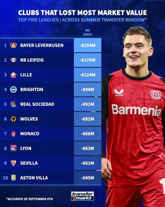 夏窗后球隊身價跌幅榜:勒沃庫森下跌2.53億歐,萊比錫1.7億第二,萊比錫,里爾隊,皇家社會,勒沃庫森隊,塞維利亞隊,阿斯頓維拉隊