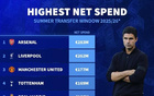 夏窗凈支出榜:阿森納領(lǐng)銜英超8隊無切爾西,皇馬&加拉塔薩雷在列,英超,曼城,皇馬,阿森納,利物浦,切爾西隊,加拉塔薩雷,皇家馬德里,月